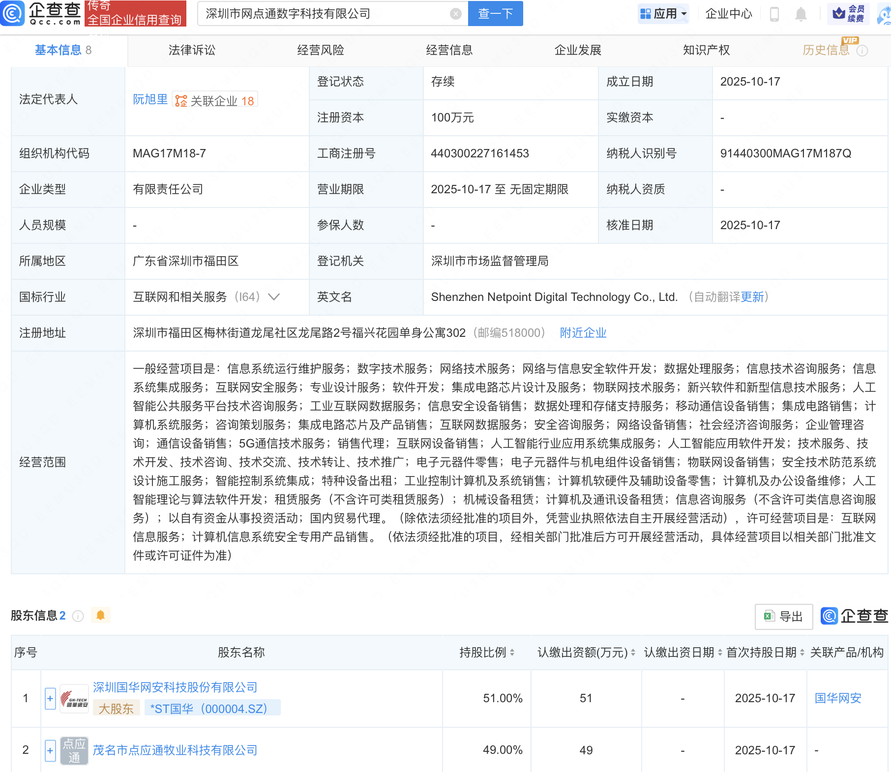 近日,深圳市网点通数字科技有限公司成立,法定代表人为阮旭里,经营范围包含:集成电路芯片设计及服务;物联网技术服务;新兴软件和新型信息技术服务;人工智能应用软件开发等。企查查股权穿透显示,该公司由*ST国华(000004)等共同持股。