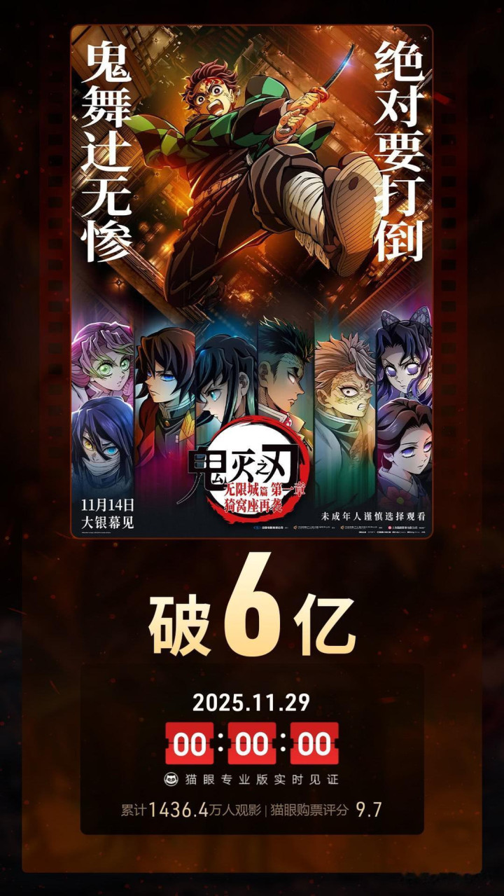 TOP2 近藤光和外崎春雄导演,花江夏树、鬼头明里、下野纮和松冈祯丞等配音的动画片《鬼灭之刃 无限城篇 第一章 猗窝座再来》当日票房525.24万,位列单日票房榜第二名,票房占比3.3%,排片占比5.3%,上映22天累计票房6.44亿人民币。