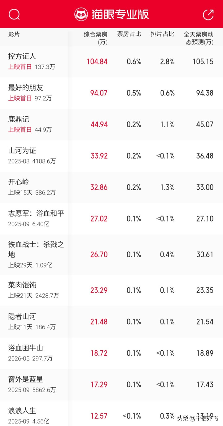 TOP6 王晓丰导演,张颂文、曾柯琅、陈永胜和王悦伊主演《我最特别的朋友》上映首日排片9057场,观影人次3.4万,场均人次3.8人,上座率4.0%,首日票房129.79万,位列单日票房榜第六名,票房占比0.8%,排片占比2.1%,再加上提前点映场累计票房133.3万人民币。