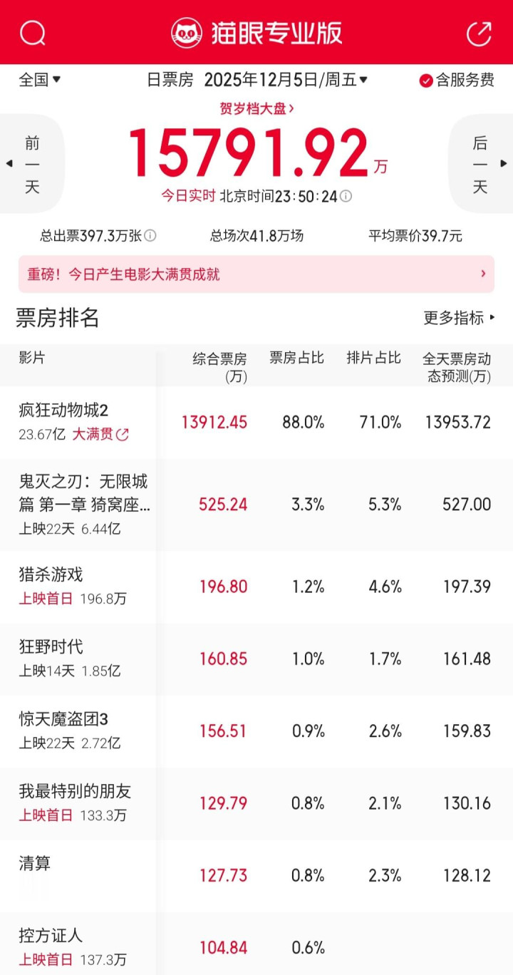 2025年12月5日(周五)截止23:50:24大盘票房15791.92万人民币;