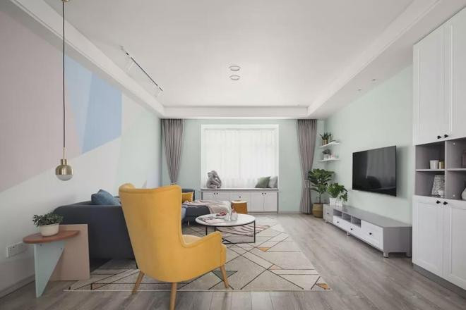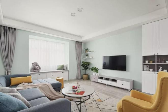 客厅的电视背景墙和侧方飘窗周边是刷成了薄荷绿,飘窗底部改成收纳柜,搭配电视柜和侧方到顶的柜子,满足一家人的收纳需求。