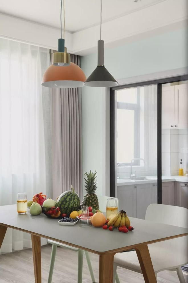餐厅空间不大,三种不同色彩、材质的吊灯和桌上的时令水果结合起来,打造出一个灵动多变的视觉感,让人感觉轻松而又惬意。
