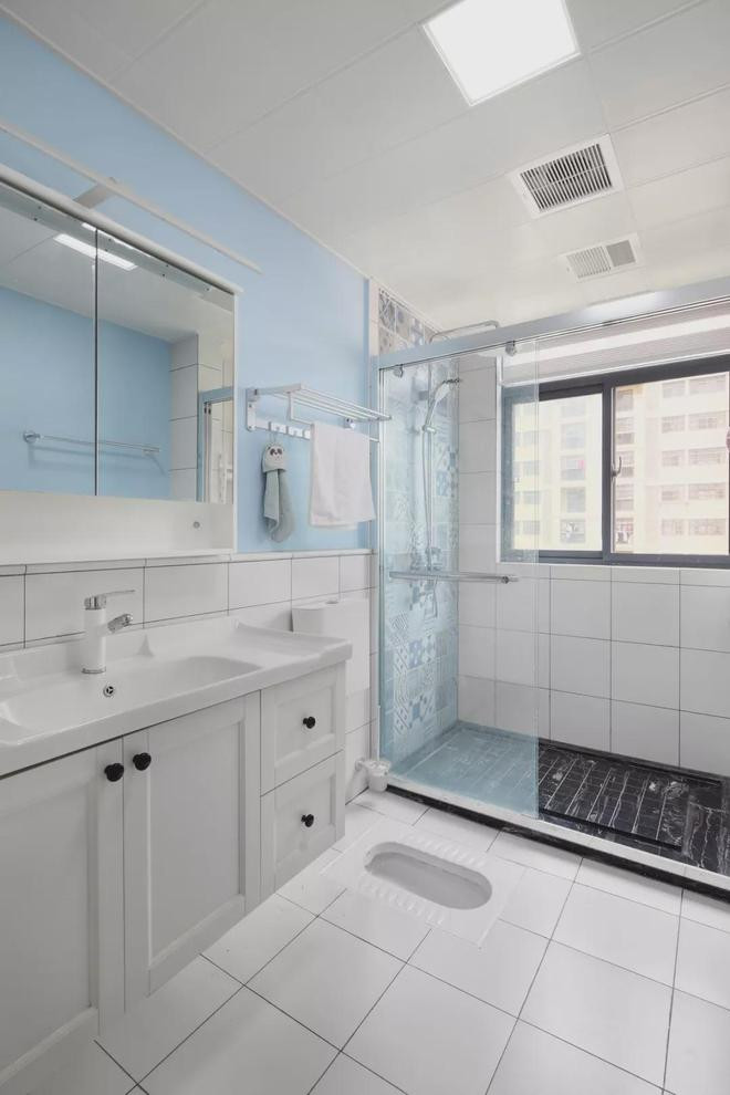 卫生间洗漱区的白色地砖延续到了腰线高处,配合天蓝色的墙面,营造格外清新的氛围。而淋浴间则以墙面花砖和地面黑砖加以区分。