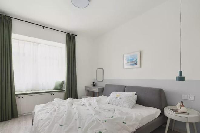 主卧室内以白色为主色调,搭配清新的绿色作为点缀,飘窗做了和客厅一样的收纳,再加上用梳妆台来代替床头柜,增强了卧室内部的收纳能力。