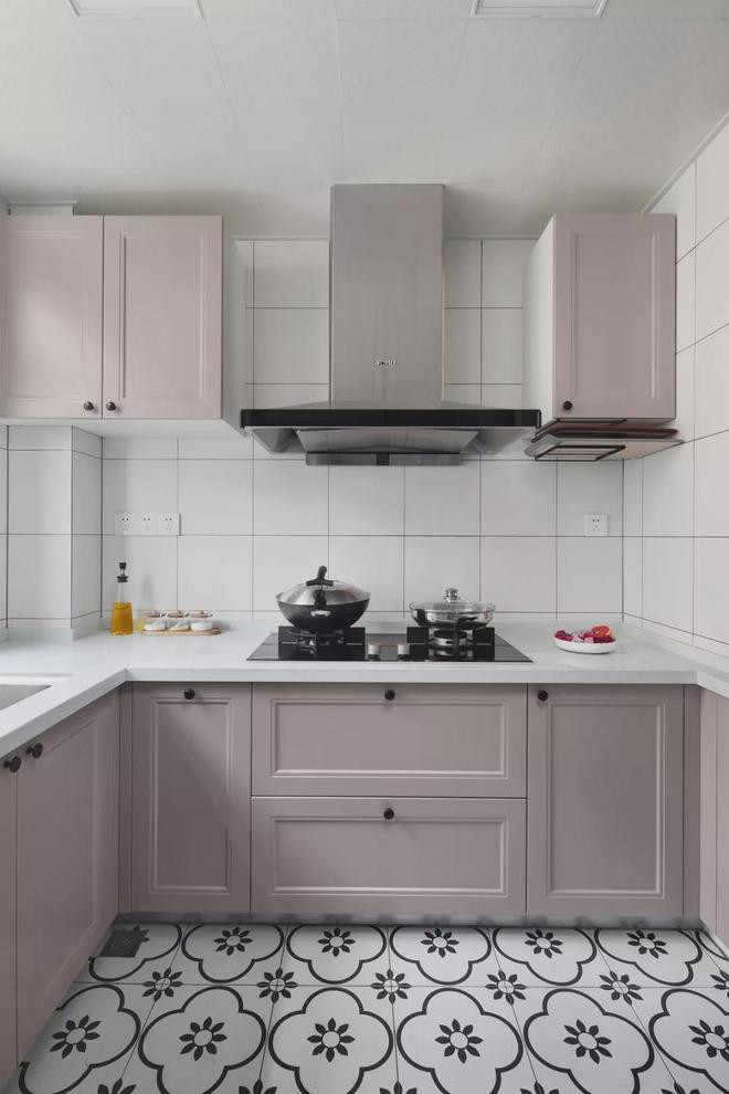 女主人作为主厨,所以厨房特意挑选了粉紫色橱柜和花砖地砖,满足自己的少女心,再琐碎的家务事也变得轻松浪漫了呢~
