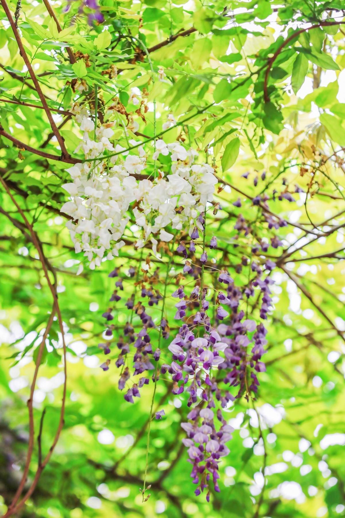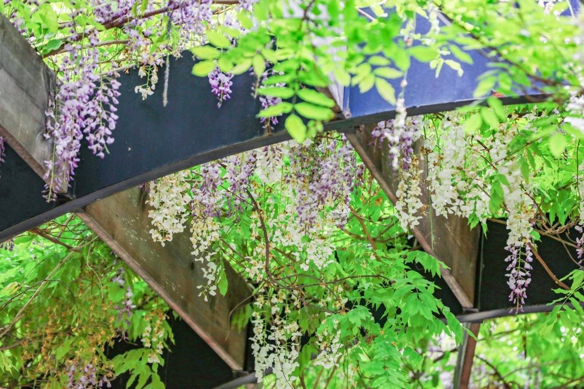 藤蔓沿廊架自然攀附,一串串蝶形花穗自然垂落,白花紫藤洁白素雅,紫花紫藤明艳动人,行在此间,花香清新怡人。