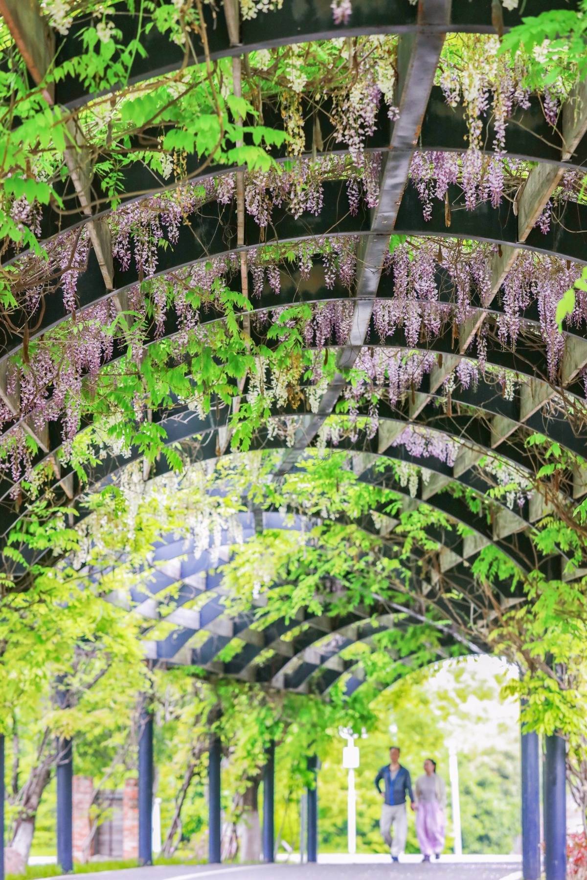 “藤花紫蒙茸,藤叶青扶疏”。当前正是紫藤最佳观赏期。游客们可前往武汉园博园张公堤段,近距离观赏紫白双色紫藤同框的独特景致,邂逅暮春限定浪漫。